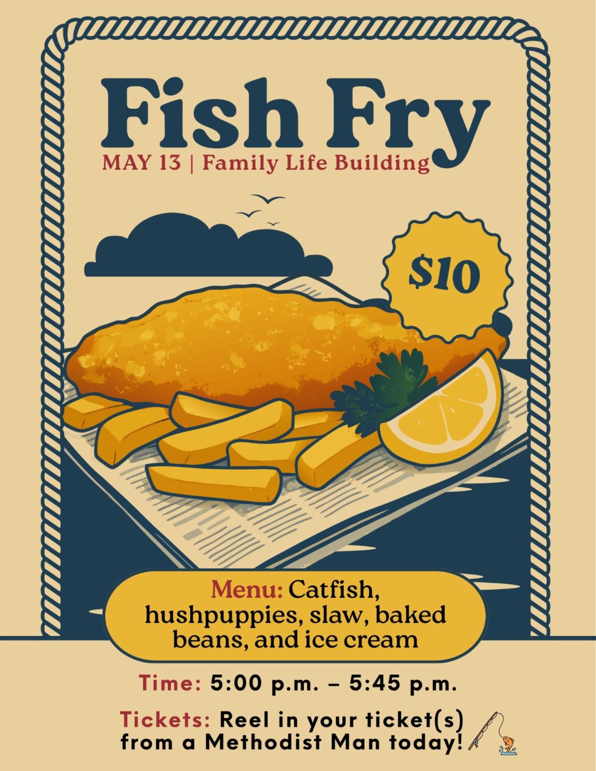 Tickets for the fish fry are $10 and can be purchased through the Methodist Men. Be sure to grab yours soon! If you have any questions, feel free to reach out to Wayne Carson or contact the church office.